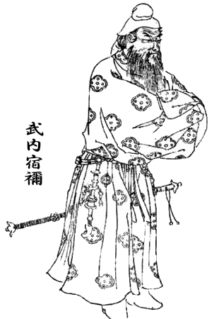 彼は景行天皇(けいこうてんのう、神話に有名なヤマトタケルノミコトの父)の時代に紀伊国名草郡で誕生し、成務(せいむ、第十三代天皇、ヤマトタケルの異母兄弟)・仲哀(ちゅうあい、第十四代天皇、ヤマトタケルの子)・応神(おうじん、第十五代)・仁徳(にんとく、第十六代)の各天皇に仕えたと伝えられています。 |